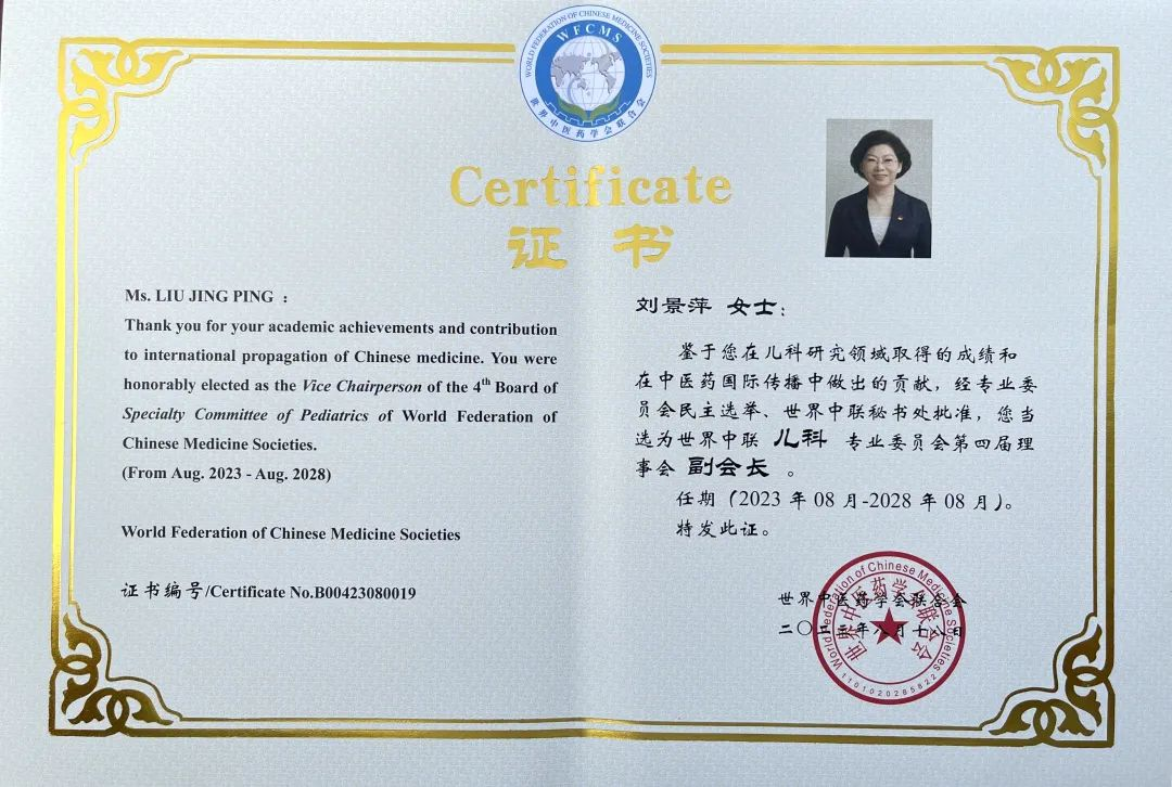 征途国际药业集团党委书记、董事长刘景萍当选世界中医药学会联合会儿科专业委员会第四届理事会副会长